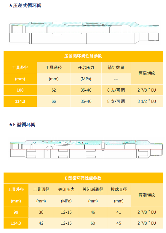 循环阀是一种井下建立油套连通的一种循环工具,一般采用投球或压差方式对循环通道进行打开或关闭操作,常用的循环阀主要有常开阀、常闭阀、压差式循环阀、E 型循环阀。